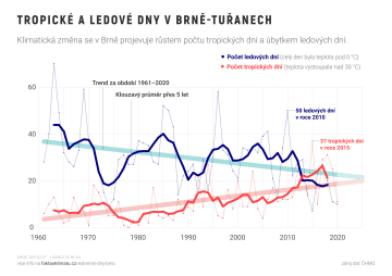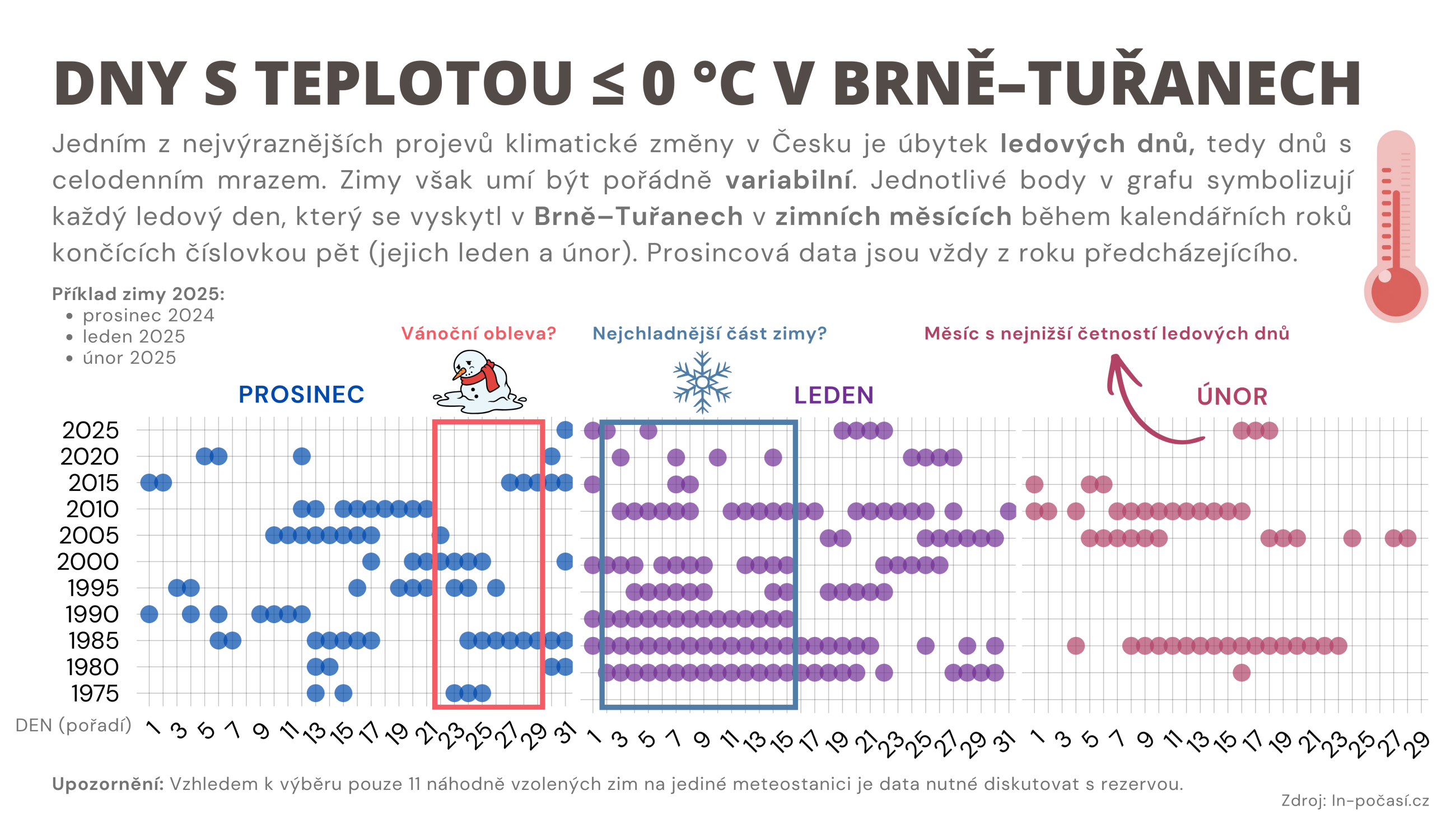 Možná znáte a třeba i ve výuce používáte infografiku z Fakta o klimatu (obrázek vpravo), díky které svým žákům můžete poměrně snadno ilustrovat, jak se mění počet tropických a ledových dnů v Brně–Tuřanech od roku 1960. Docela nepřekvapivě, počet tropických dnů (dny, kdy je překonána teplota 30 °C) roste, naopak počet ledových dnů (dny, kdy teplota nepřekoná 0 °C) klesá. Tato infografika nám ovšem neprozradí více o průběhu jednotlivých zim na našem území. A právě na to jsem se chtěl při tvorbě své infografiky zaměřit. Vybral jsem si proto totožnou meteorologickou stanici. Data jsem bral z denních statistik zpřístupněných na webu in-pocasi.cz. Pro analýzu jsem 11 náhodných zim (toto číslo vychází z toho, že jsem se rozhodl zaměřit na posledních 50 let).