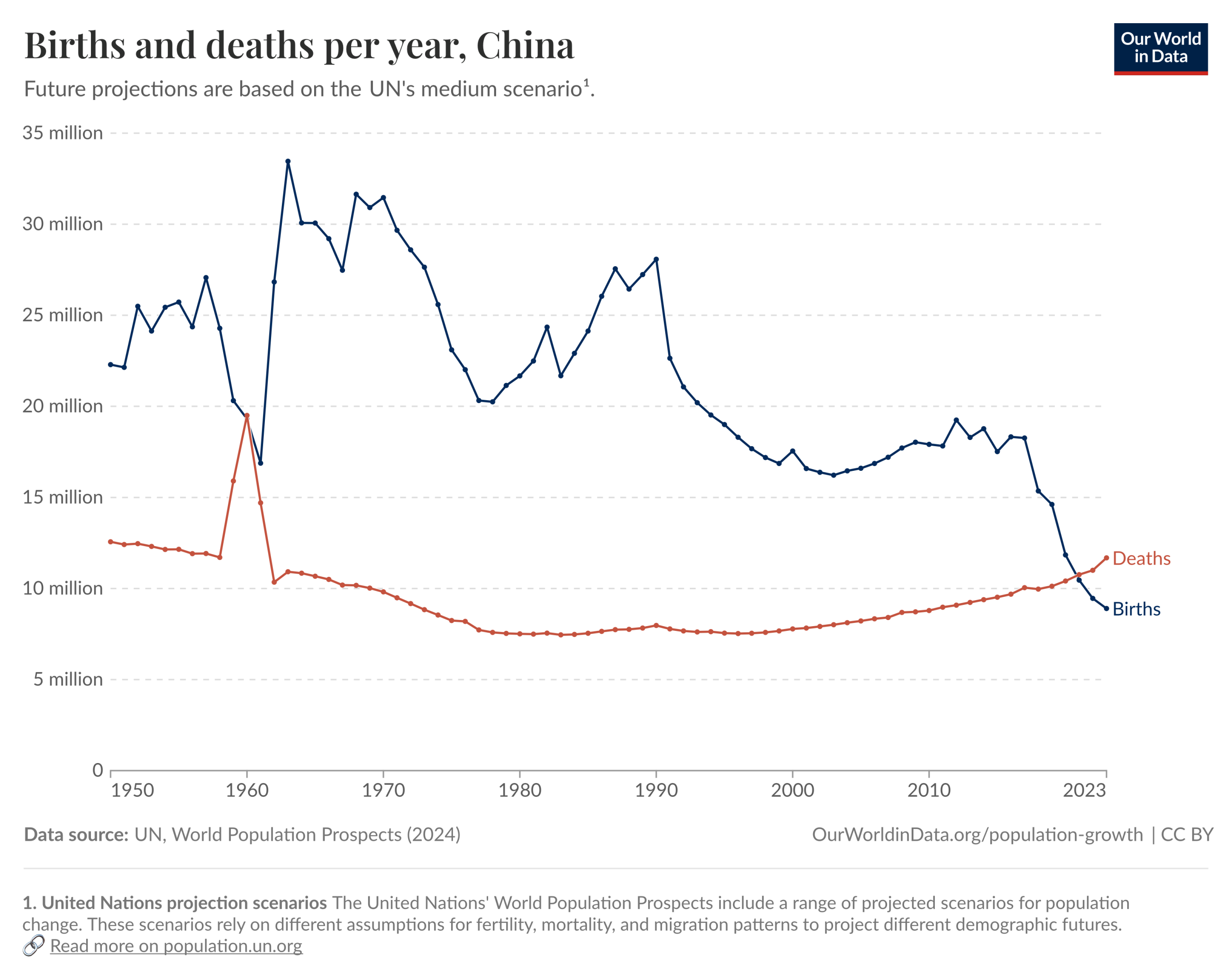 Z druhého grafu můžeme zjistit, že nejvíce dětí se v Číně narodilo v roce 1963. Bylo jich 33,5 mil. a důvodem této zvýšené porodnosti bylo jistě i uvolnění společnosti po letech hladomoru. V roce 2024 se v Číně narodilo naopak nejméně dětí v historii, konkrétně 8,8 mil. (čísla je nutné brát s určitou rezervou vzhledem k nestabilním metodám sčítání).