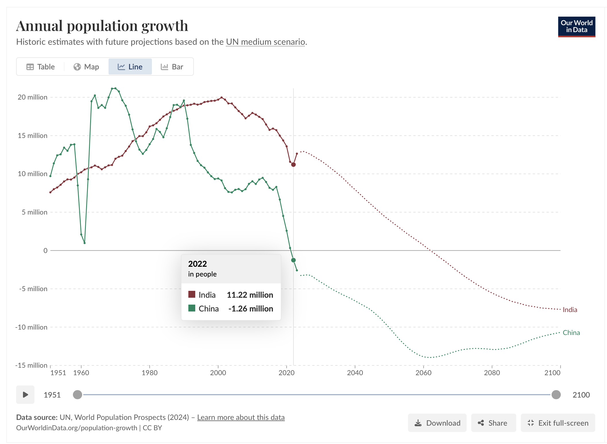 Ve výuce používám níže uvedený graf z produkce Our World in Data (CC BY 4.0). Ten velmi efektivně porovnává roční přírůstky populace Číny a Indie. Snadno tak můžete ilustrovat, že v roce 2022 populace Číny po velmi dlouhé době poprvé klesla (o více než 1 milion) a budoucí predikce nepředpokládají žádnou změnu. Naopak v Indii ve stejném roce přibylo více obyvatel, než kolik žije v celém Česku. Predikce předpokládají, že rok zlomu v Indii nastane až po roce 2060. Mým osobním tipem je, že to v souvislosti s rychlým rozvojem světa a s tím spojeným měnícím se postojem k mateřství, bude o něco dříve.