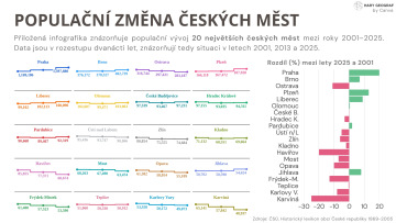 I v posledních dvaceti letech prodělaly naše města z hlediska vývoje populace velké změny. Zatímco největší města rostla z důvodu efektu magnetu - nejvíce Praha (množství služeb obyvatele přitahuje), populace měst kolem 100 tisíc obyvatel stagnovala, v menších městech populace klesala (viz doprovodný graf, pravá část infografiky). Tato města již pravděpodobně nemají takovou sílu vycházející z nabídky svých služeb, aby tato síla převážila suburbanizační tlaky.