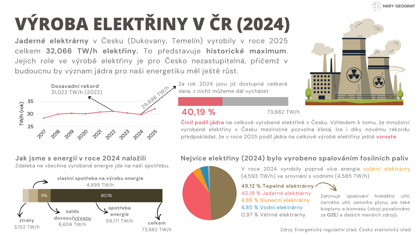Prostože začal kalendářní rok 2026, na informace o výrobě elektřiny v Česku za rok 2025 ještě nějakou dobu musíme počkat. Přesto hned první den nového roku vyšel článek, který zhodnotil výrobu našich jaderných elektráren (Temelín, Dukovany) za rok 2025. A rok to byl mimořádný rok. Naše jaderné elektrárny během něj vyrobily 32,066 TW/h elektřiny, což je absolutní rekord. Jak se ale v tomto čísle zorientovat? V tomto článku se podrobněji podíváme na to, jak to s výrobou elektřiny v Česku aktuálně je. Do výuky vám může posloužit shrnující grafika, kterou jsem pro vás vytvořil. Stáhněte si ji níže.